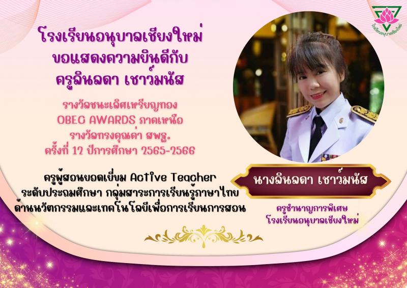 โรงเรียนอนุบาลเชียงใหม่ขอแสดงความยินดีกับคุณครูลินลดา เชาว์มนัส ที่ได้รับรางวัล OBEC AWARD ภาคเหนือ ..