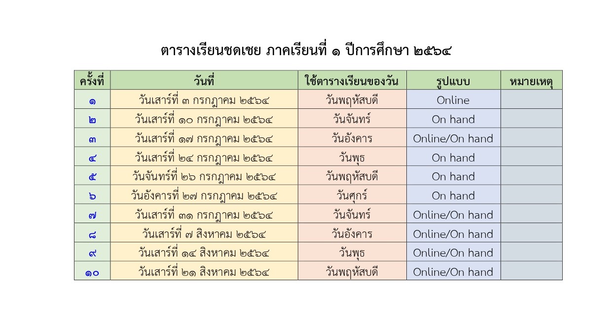 ตารางการจัดการเรียนสอนรายสัปดาห์ชดเชยภาคเรียนที่ 1 ปีการศึกษา 2564