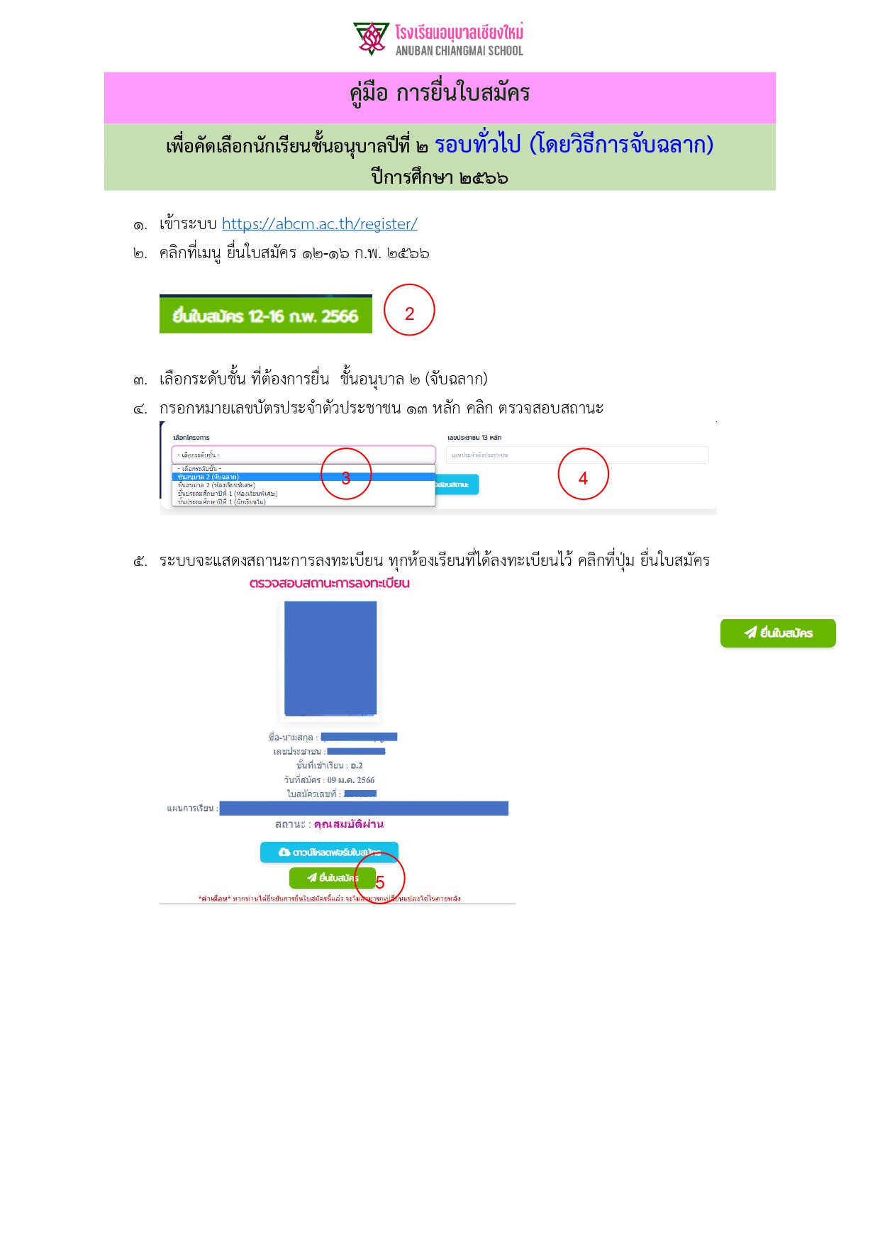 คู่มือยื่นใบสมัครผ่านระบบออนไลน์ สำหรับผู้สมัครคัดเลือกชั้นอนุบาลปีที่ 2 รอบทั่วไป (โดยวิธีจับฉลาก)