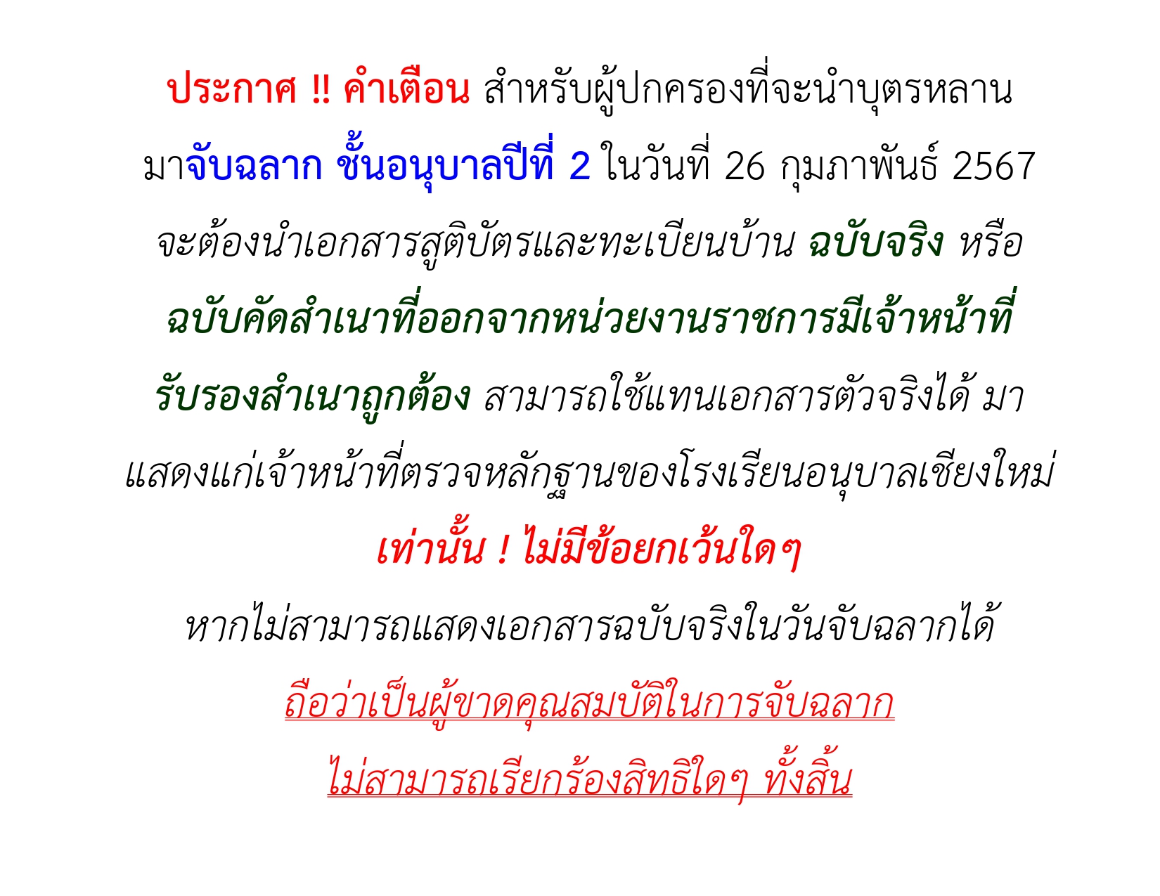 ประกาศเตือน !! และให้เตรียมการ สำหรับผู้ปกครอง อ.2 จับฉลาก