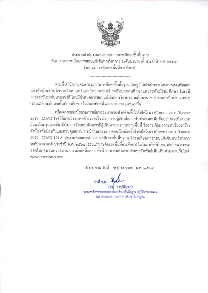 ประกาศเลื่อนการสอบแข่งขันวิชาการ ระดับนานาชาติ ประจำปี พ.ศ. 2564 (รอบแรก ระดับเขตพื้นที่การศึกษา)