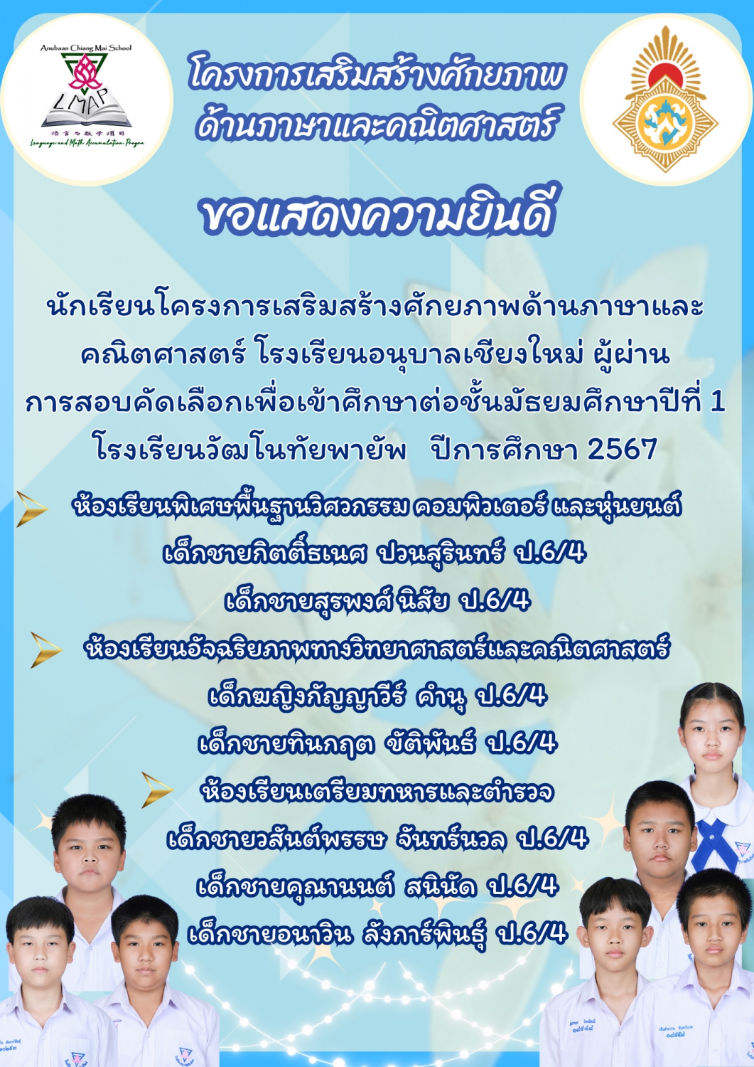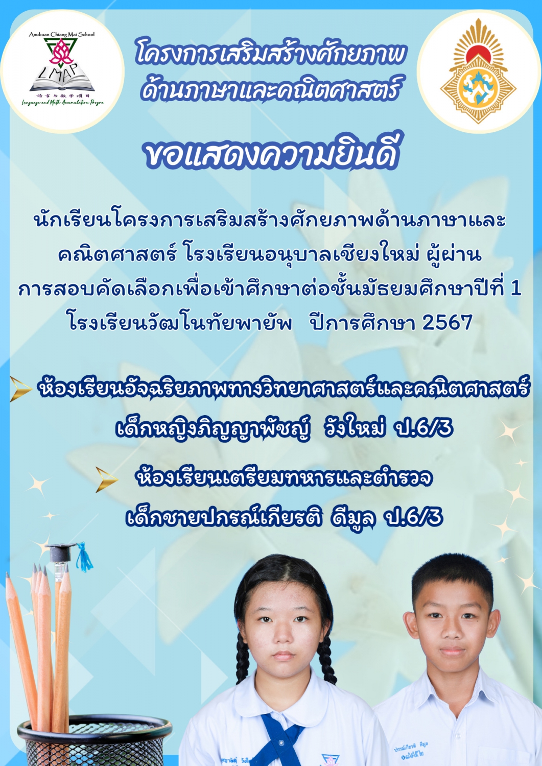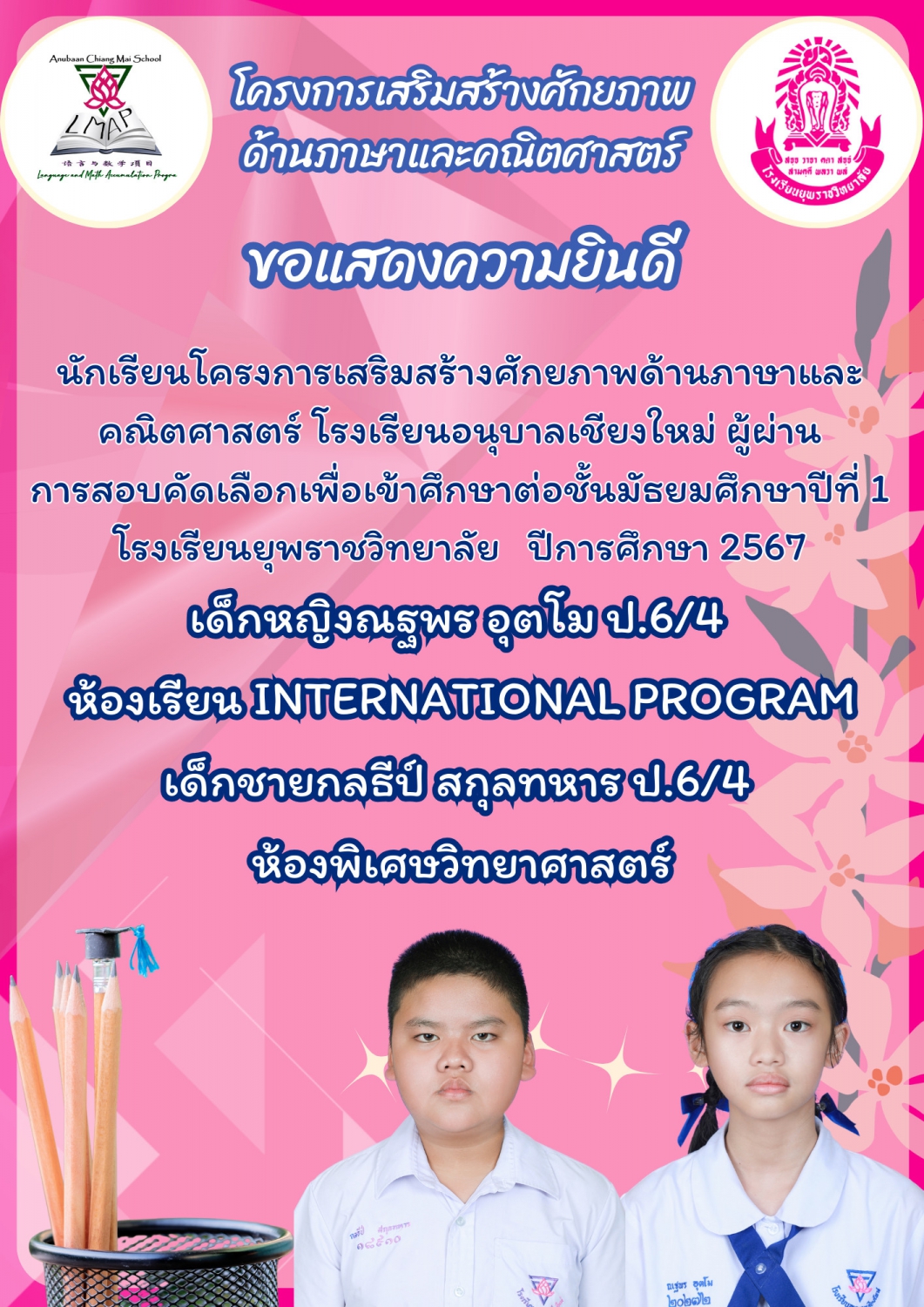 ขอแสดงความยินดีกับนักเรียนระดับชั้นประถมศึกษาปีที่ ๖ ประจำปีการศึกษา ๒๕๖๖ โรงเรียนอนุบาลเชียงใหม่ ในการสอบโครงการห้องเรียนพิเศษของโรงเรียนยุพราชวิทยาลัยและโรงเรียนวัฒโนทัยพายัพ ซึ่งทำให้นักเรียนของเรามีที่เรียนต่อเกือบครบร้อยเปอร์เซ็นแล้ว