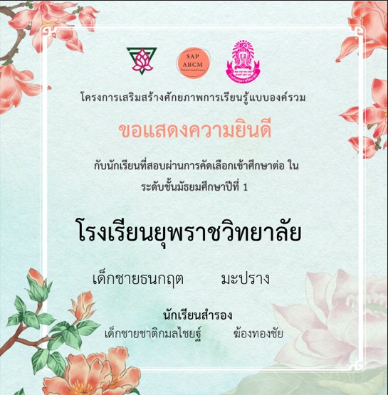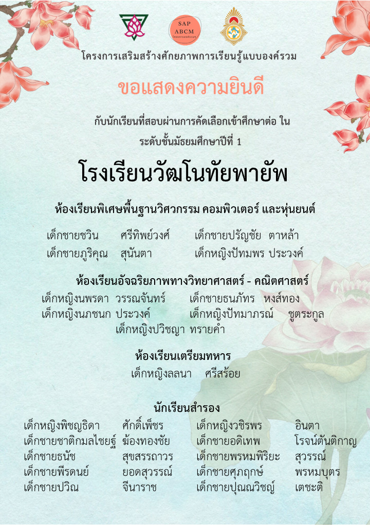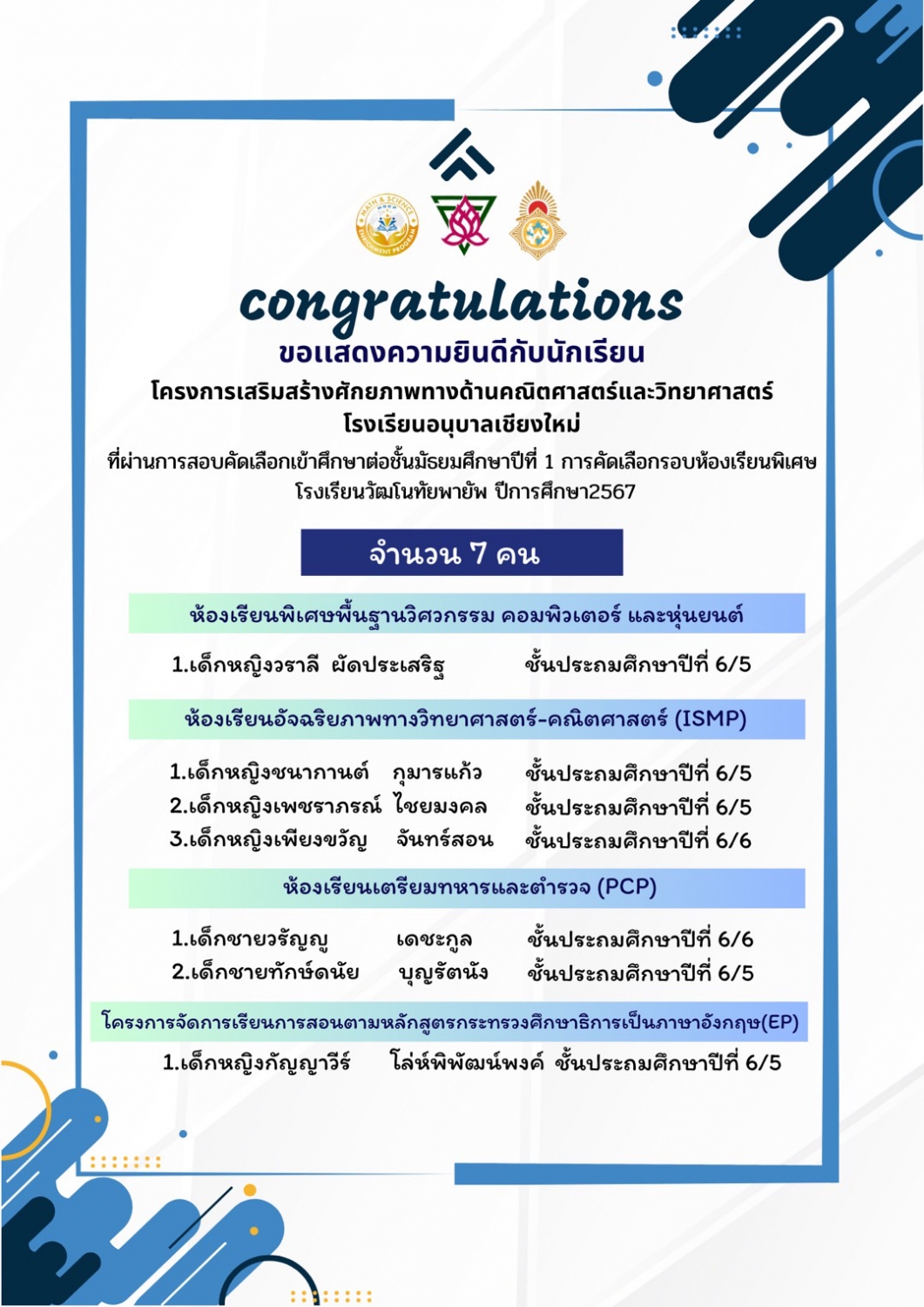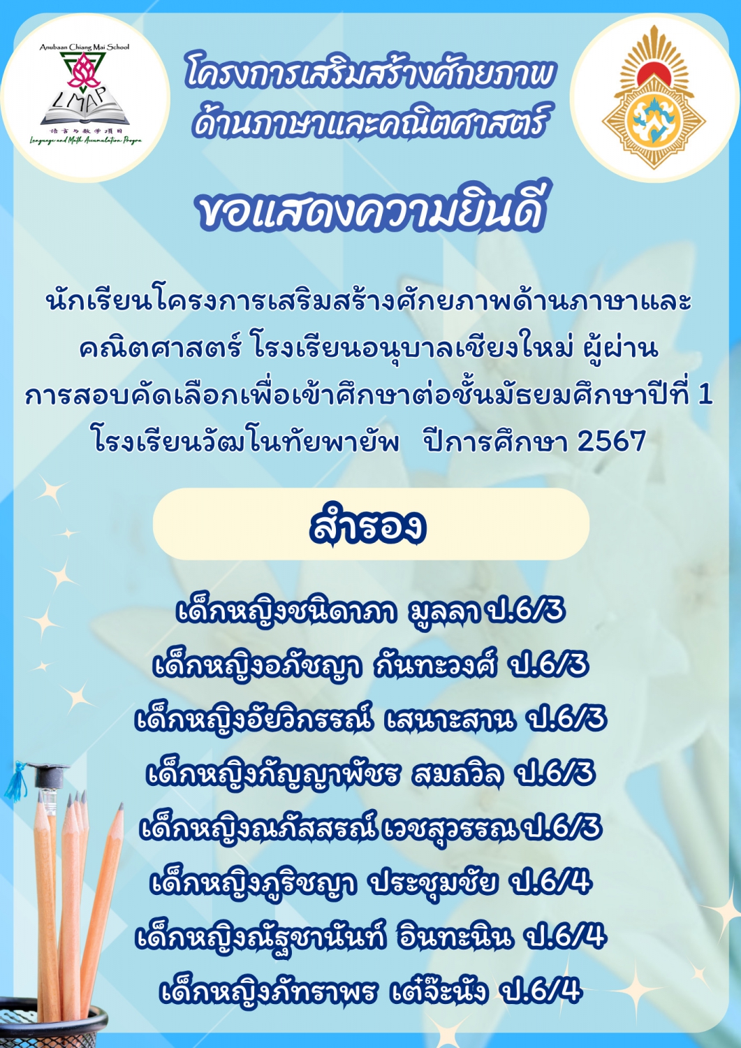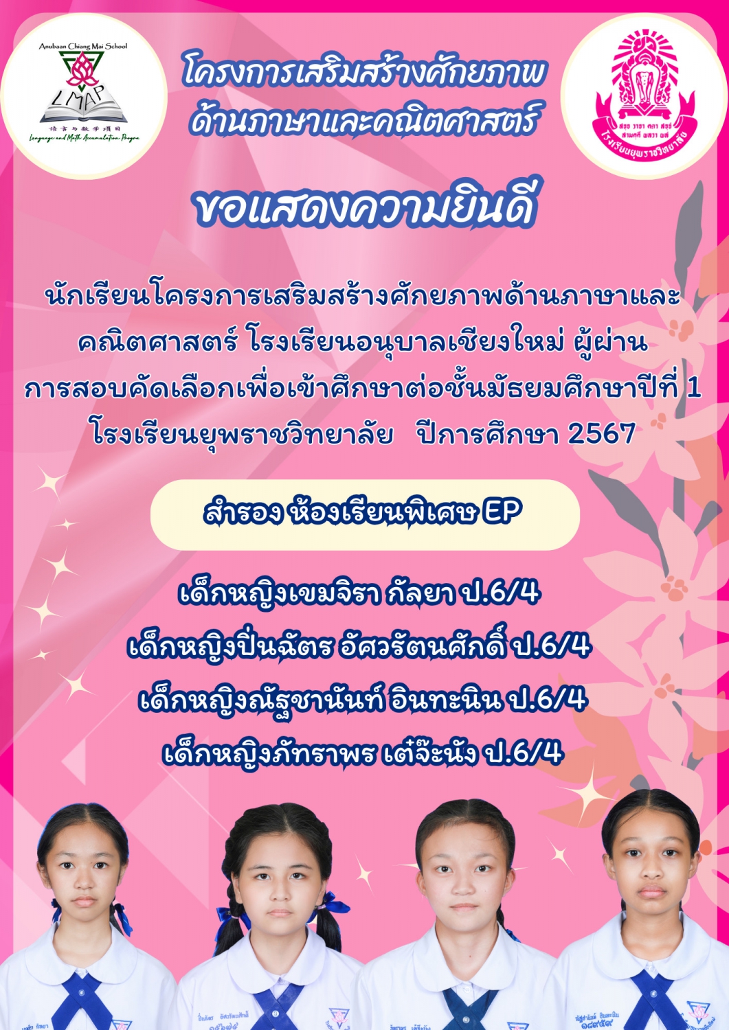 ขอแสดงความยินดีกับนักเรียนระดับชั้นประถมศึกษาปีที่ ๖ ประจำปีการศึกษา ๒๕๖๖ โรงเรียนอนุบาลเชียงใหม่ ในการสอบโครงการห้องเรียนพิเศษของโรงเรียนยุพราชวิทยาลัยและโรงเรียนวัฒโนทัยพายัพ ซึ่งทำให้นักเรียนของเรามีที่เรียนต่อเกือบครบร้อยเปอร์เซ็นแล้ว